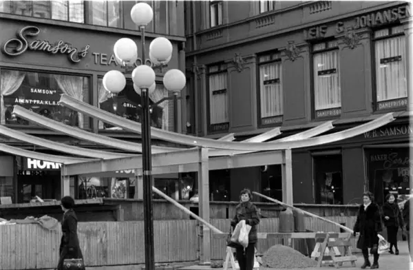 Bygging av "hatten" over nedgangen til Sentrum (senere Stortinget) stasjon på Egertorget.