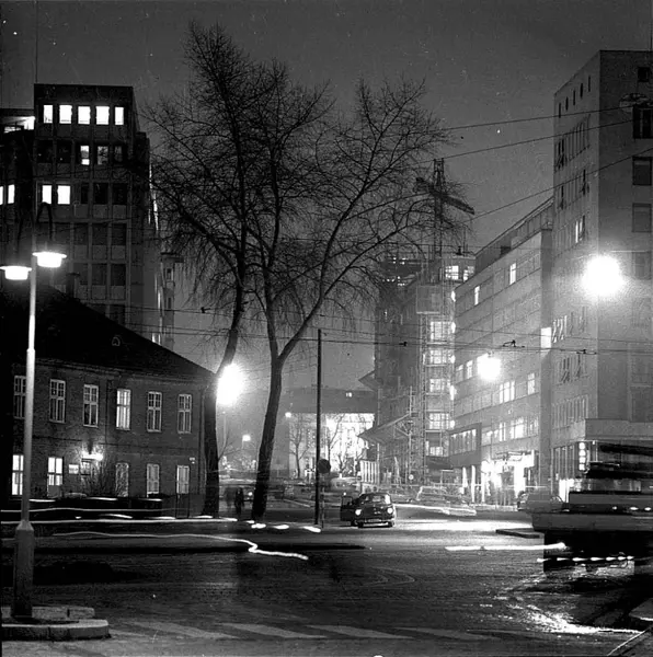 gatekryss, Vika politistasjon, kontorbygninger, byggevirksomhet, stillas, kran, bil, nattemørke