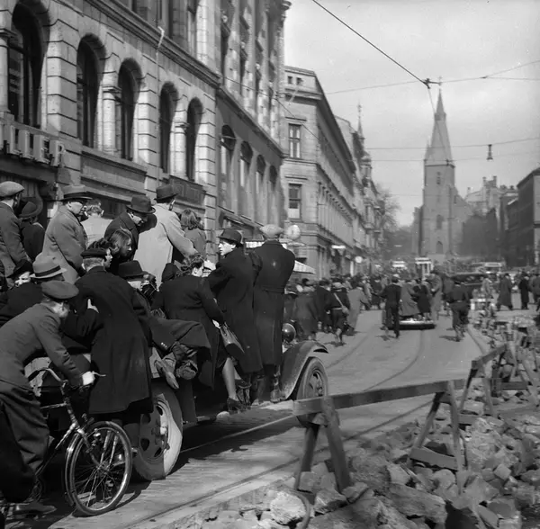 krigsutbrudd, gate, mennesker, flukt, biler, bygårder, St. Olav Domkirke