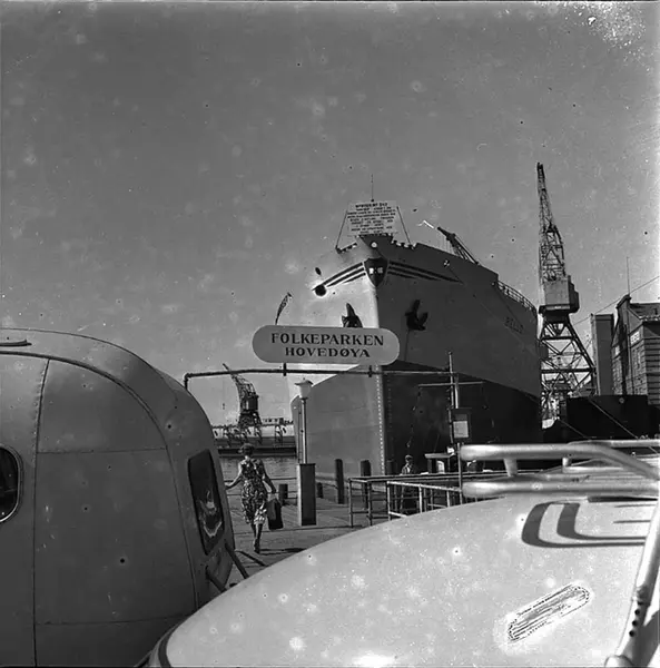 brygge, skilt: Folkeparken Hovedøya, kvinne, Akers mek. Verksted, skip, kraner, bil, campingvogn