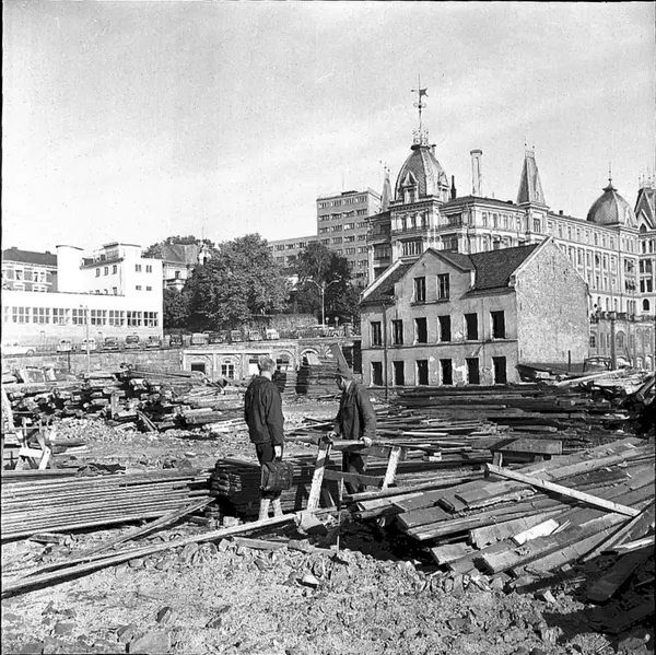 rivningstomt, menn, plankestabler, bygård, Ruseløkka skole, Ruseløkkbasarene, Ingeniørenes Hus, villa, Victoria terrasse