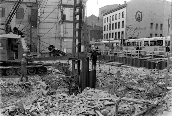 rivningstomt, anleggsmaskin, menn, fundamentering, forretningsgårder, trikk