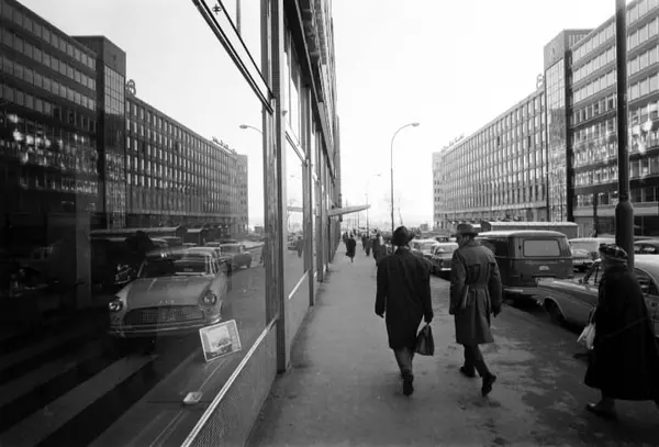 gateløp, fortau, mennesker, biler, kontorbygninger, bilforretning, speiling