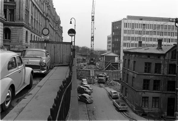 utsikt, gateløp, biler, anleggsarbeid, kran, bygårder, Victoria terrasse, kontorbygning