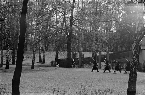 Slottsparken, gardister marsjerer, kvinne, barnepleierske, gutt, prins, mann, hund