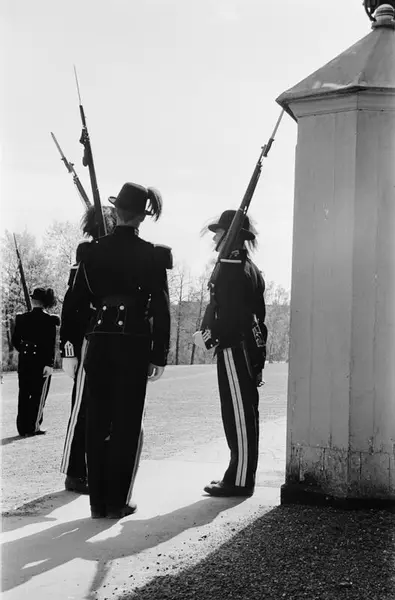 Slottsplassen, gardister, uniformer, geværer, skilderhus