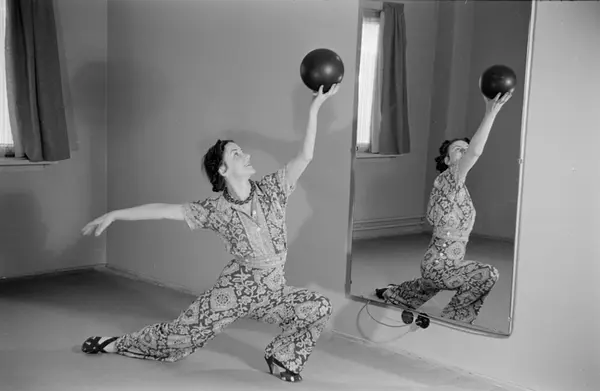kvinne, skuespiller, morgengymnastikk, ball, speil