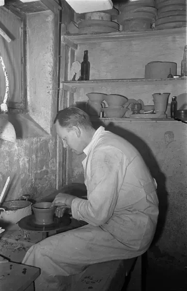 Norsk Keramik-Industri, keramikkverksted, interiør, mann, keramiker, sittende knefigur, dreieskive
