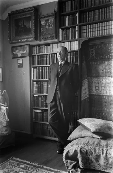 mann, forfatter, stående helfigur, interiør, divan, veggteppe, bokhyller