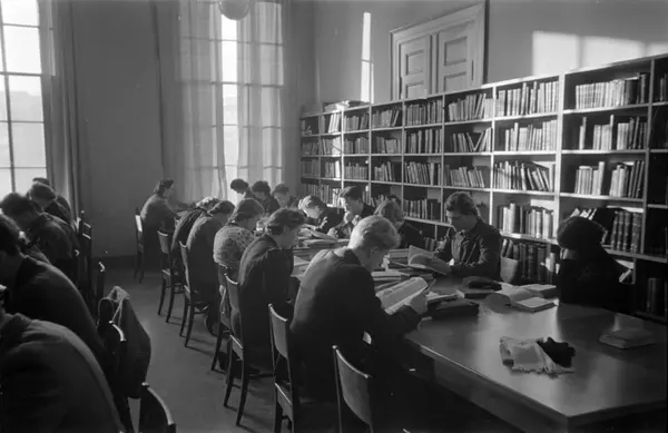 Universitetet, interiør, lesesal, kvinner, menn, studenter, bokhylle