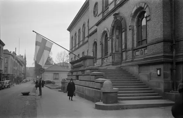 gateløp, Nasjonalgalleriet, trapp, finsk flagg i forbindelse med Finlandshjelpen, mennesker, biler, forretningsgårder