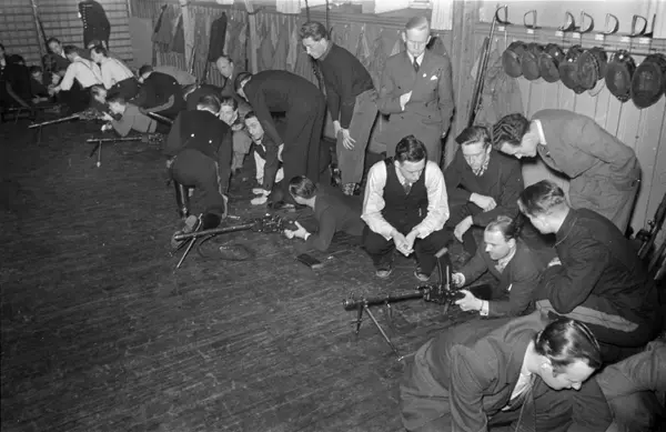 Hegdehaugen skole, interiør, gymnastikksal, menn, studenter, våpen, frivillig militæropplæring