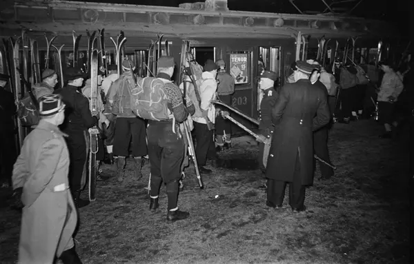Majorstuen stasjon, menn, studenter, ski, frivillig militæropplæring, trikk