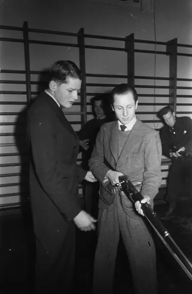 Hegdehaugen skole, interiør, gymnastikksal, menn, studenter, geværer, frivillig militæropplæring