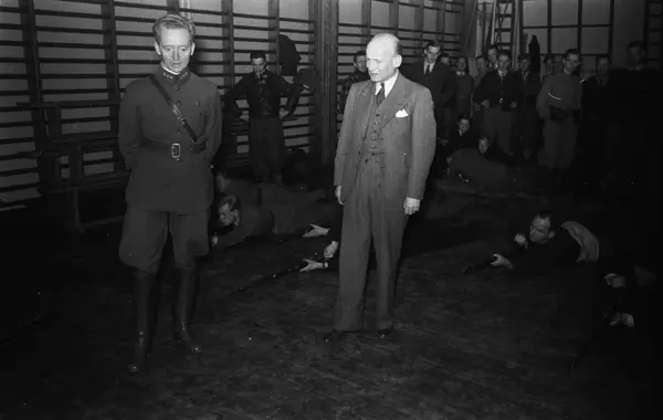 Hegdehaugen skole, interiør, gymnastikksal, menn, studenter, geværer, frivillig militæropplæring