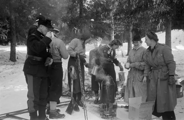 menn, studenter, soldater, ski, frivillig militæropplæring, kvinner, primus, utdeling av mat
