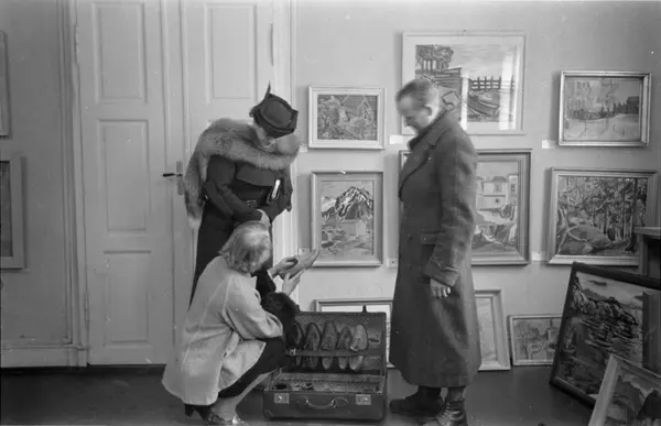 Unge Kunstneres Samfunds varebyttesentral, kvinner, mann, koffert, sko, malerier