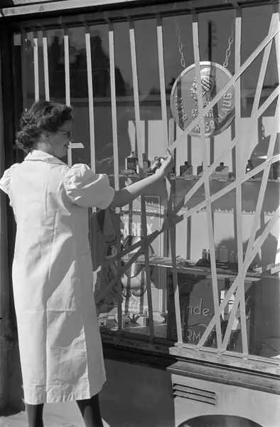 krigsutbrudd, forretningsgård, Lunde parfymeri, utstillingsvindu, kvinne, sikring av vindu med sikringstape