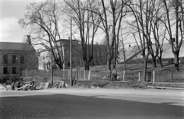 krigsutbrudd, park, gjerde, soldater, gravearbeid, veiarbeidere, lastebil, bygårder