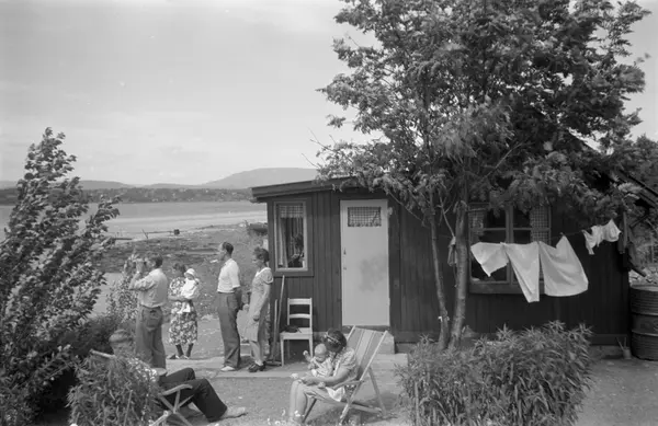 hytte, hage, fluktstoler, menn, kvinner, barn, klestørk, strand, fjord