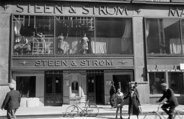 Steen & Strøm stormagasin, fortau, mennesker, sykler, vinduer, rengjøring, fjerning av sikringstape, vindusforblendinger