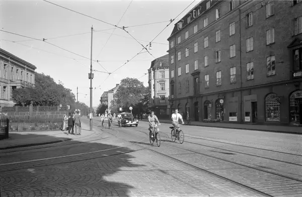gateløp, mennesker, sykler, biler, trikkeskinner, forretningsgårder, Handelsbygningen