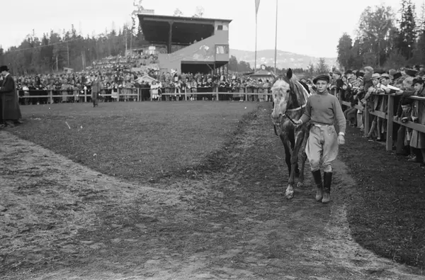 Øvrevoll galoppbane, hest, mann, jockey, tilskuere