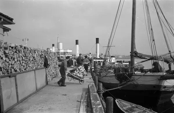 brygge, vedstabler, menn, seilfartøy, dampbåter, Dronningen