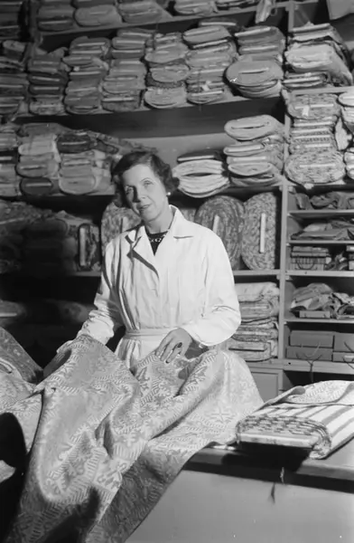 Von der Lippes møbelforretning, interiør, kvinne, innehaver, motstandskvinne, disk, tekstilruller