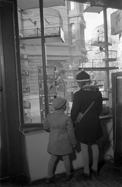 Aquarium dyreforretning, utstillingsvindu, fuglebur, fugler, barn