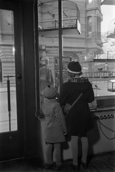 Aquarium dyreforretning, utstillingsvindu, fuglebur, fugler, barn