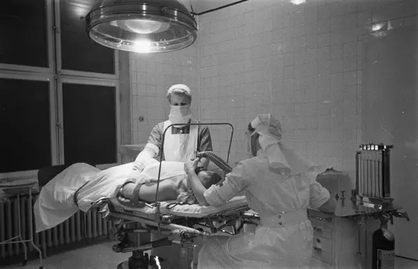 Røde Kors Klinikk, interiør, operasjonsstue, forberedelse til operasjon, lege, sykepleier, pasient, anestesi