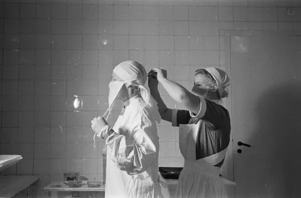 Røde Kors Klinikk, interiør, operasjonsstue, forberedelse til operasjon, lege, sykepleier, påsetting av munnbind