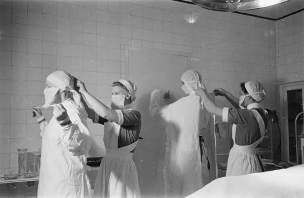 Røde Kors Klinikk, interiør, operasjonsstue, forberedelse til operasjon, leger, sykepleiere, påsetting av munnbind