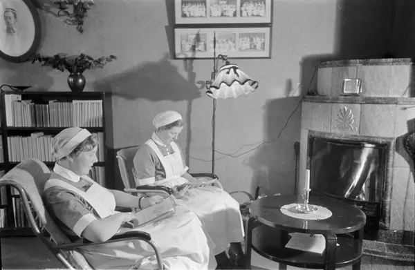 Røde Kors sykepleierskole, internat, interiør, peisestue, kvinner, sykepleiere