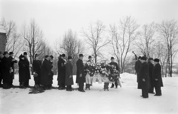 Østre Aker kirkegård, begravelse, kvinner, menn, marskalker, marskalkstaver, kiste, granbar, krakker, snø