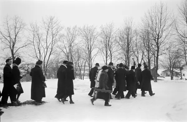 Østre Aker kirkegård, begravelse, kvinner, menn, marskalker, marskalkstaver, kiste, granbar, krakker, snø