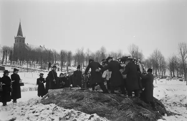 Østre Aker kirkegård, begravelse, kvinner, menn, marskalker, marskalkstaver, kiste, granbar, krakker, snø, Østre Aker kirke