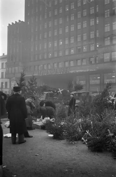 torg, mennesker, juletresalg, kontorbygning, kino Verdensteatret