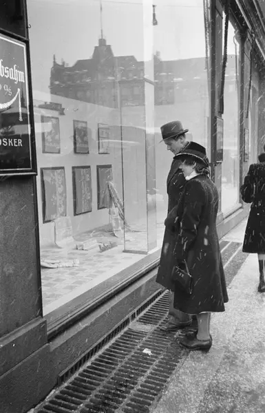forretningsgård, Otto Robsahm & Co. manufaktur og konfeksjonsforretning, utstillingsvindu, kvinne, mann, snø