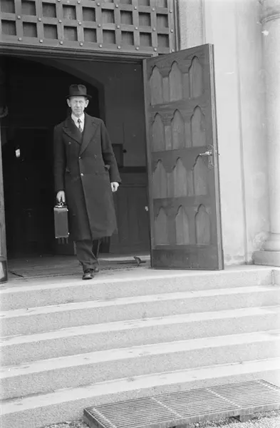 Ullern kirke, sør, trapp, etter påskegudstjenesten, mann
