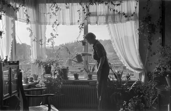 bolig, interiør, stue, kvinne, vindu, potteplanter, vanning
