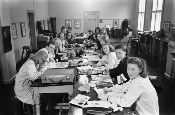 Statens Håndverks- og Kunstindustriskole, motelinjen, interiør, kvinner, mann, elever, hund