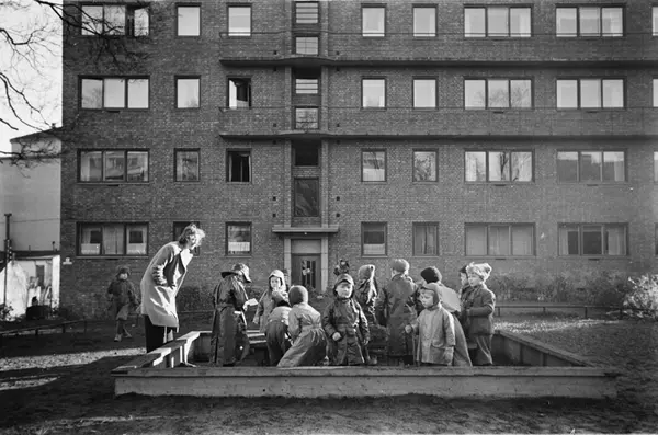 lekeplass, sandkasse, barn, kvinne, boligblokk