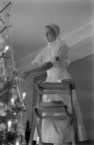 Røde Kors klinikk, interiør, kvinne, sykepleierske, pynting av juletre