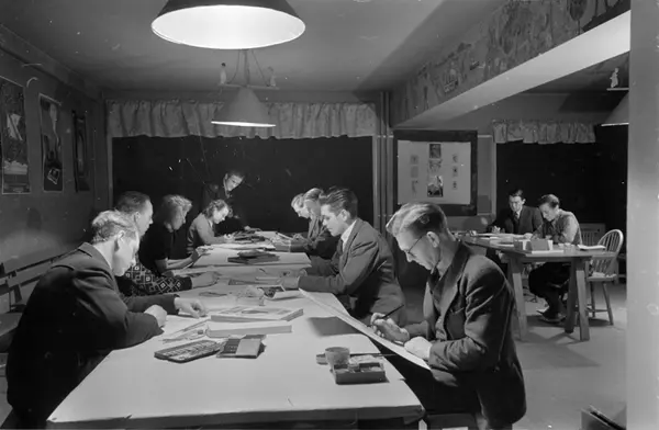 Spanges tegneskole, interiør, tegnekurs, menn, kvinner, tegnere, blendingsgardiner