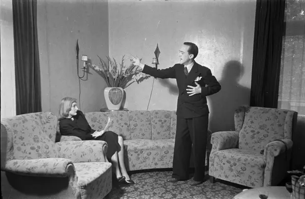 bolig, interiør, stue, mann, revyskuespiller, kvinne, ektepar, vase, gladioler