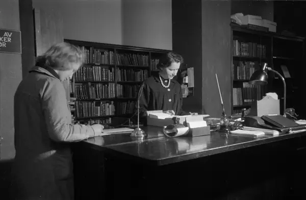 Deichmanske bibliotek, interiør, utlånsskranke, kvinner, bibliotekar, kunde, bokhyller