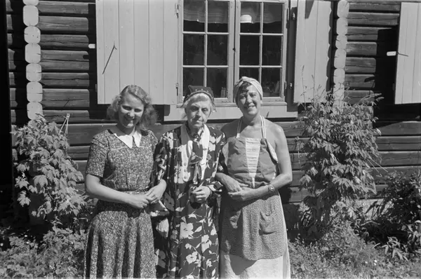"Ut i solen-stua", kvinner, stående halvfigur, hage, tømmerhus