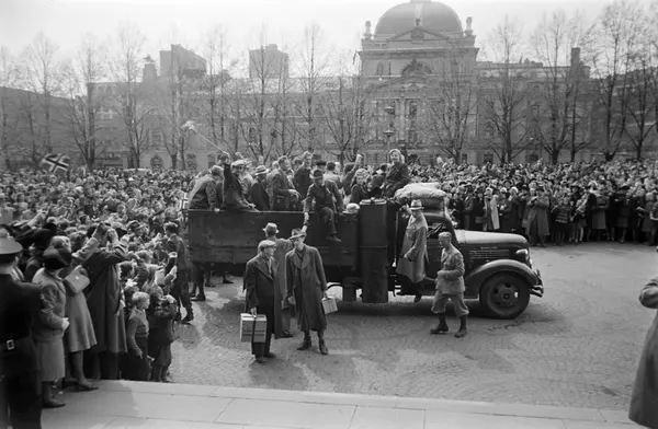 Universitetsplassen, lastebil, mennesker, løslatte Grinifanger, tilskuere, Nationaltheatret